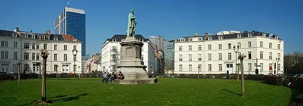 Vue depuis le boulevard, la place apparaît comme un décor de spectacle que Poelaert a renforcé par une rotonde gazonnée au centre, comme une scène de théâtre entourée d’une grille ouvragée jalonnée de réverbères sculpturaux, ainsi préparée pour recevoir un acteur-vedette. Cette vedette, c'est André Vésale, le père de l'anatomie au XVIe siècle. Peu après l'achèvement de la place, sa statue, œuvre de Joseph Geefs coulée dans le bronze en 1846, fut dressée au centre de la pelouse sur un socle dessiné par l'architecte Hector Goffart (Bruxelles, 18.....-Bruxelles 1869) qui fut aussi échevin des travaux publics de Bruxelles. Inaugurées en 1847 par Léopold Ier, la place et la statue ont traversé les offenses faites à l'urbanisme et aux monuments bruxellois en restant intactes, assumant le rôle figé d'être un point de focalisation spectaculaire des regards pendant plus de cent soixante ans.