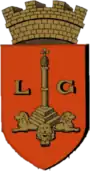 L'ensemble s'achève par un couronnement mouluré, à nouveau orné de blasons et surmonté de la pomme de pin.