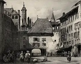 Une lithographie du peintre romantique britannique Richard Parkes Bonington montre le bas de la place dans les années 1820. Le regard sur le lac au travers de l'arcade est mis en valeur, du linge pend dans les étages, certains volets sont de guingois[15]. Les bâtiments qui surplombent l’arcade en direction du lac ont été démolis en 1871[5].