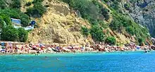 La plage se présente comme une bande étroite d'une longueur de 450 mètres[1] de petits galets de différentes couleurs[3], sous une falaise de plus de 150 m de hauteur. Elle se distingue par une eau limpide et des paysages pittoresques[1],[4],[5].