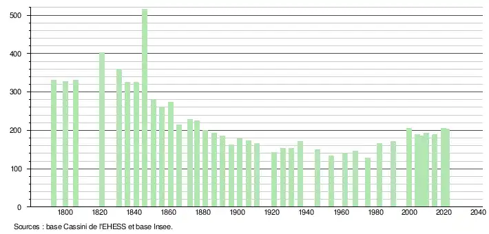 L'évolution du nombre d'habitants est connue à travers les recensements de la population effectués dans la commune depuis 1793. Pour les communes de moins de 10 000 habitants, une enquête de recensement portant sur toute la population est réalisée tous les cinq ans, les populations légales des années intermédiaires étant quant à elles estimées par interpolation ou extrapolation[27]. Pour la commune, le premier recensement exhaustif entrant dans le cadre du nouveau dispositif a été réalisé en 2004[28].
