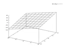 De même, en représentant l’espace comme l’ensemble des triplets de nombres réels, un plan est l’ensemble des solutions d’une équation cartésienne de la forme , où les coefficients ne sont pas tous nuls. Les plans apparaissent ainsi comme les surfaces de niveau d’une forme linéaire dans l’espace.