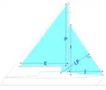- P : Hauteur du guindant de la grand-voile, mesurée le long de l'arrière du mât à partir du haut du bôme jusqu'au point le plus haut sur le mât ou la grand-voile peut être hissée.