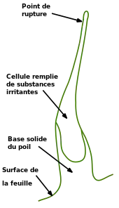 Bien que les poils urticants sont présents dans plusieurs familles de plantes non apparentées, leur structure est généralement similaire. Une base solide supporte une seule cellule allongée à l'extrémité cassante. Lorsque l'extrémité est cassée, la pointe aigüe exposée pénètre dans la peau et la pression injecte des toxines. Les produits chimiques précis impliqués dans la douleur et l'irritation ne sont pas encore entièrement identifiés.