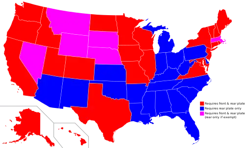 - L'État demande une plaque à l'avant et à l'arrière de la plupart des véhicules de tourisme