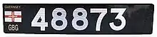 J999999 - Le bailliage de Guernesey utilise deux formats différents : l'un pour Guernesey, l'autre pour Aurigny. Les véhicules à moteur autres que les tracteurs sont interdits à Herm et Sercq. Guernesey a des plaques soit noires soit jaunes ou blanches comme le Royaume-Uni. Elles ne contiennent qu'une série d'un à cinq chiffres[28].