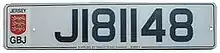 AMN-999 - Le bailliage de Jersey utilise des plaques de même couleur que le Royaume-Uni avec la mention J suivie d'un à six chiffres[27].