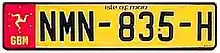 - L'Île de Man utilise des plaques de mêmes couleurs que le Royaume-Uni. Les plaques noires sont autorisées sur les véhicules immatriculés avant 1990[25]. Le format actuel comprend une lettre de série, la mention MN puis un tiret et trois chiffres. Les plaques personnalisées sont autorisées[26].