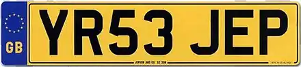 Certaines plaques britanniques sont conformes à la directive de l'Union européenne de 1998 qui préconise un cartouche bleu à gauche comprenant le code du pays et les étoiles du drapeau européen[3]. Cependant, ce cartouche, appelé eurobande, n'est pas obligatoire au Royaume-Uni[1]. La régulation à propos de l'eurobande ne concerne que les États ayant ratifié la Convention de Vienne de 1968, qui le Royaume-Uni signé pour la première fois en 2018. Le pays a également signé la Convention de Genève de 1949, qui oblige les propriétaires à apposer un ovale contenant le code pays à l'arrière de leur véhicule lorsqu'ils se rendent à l'étranger[4].