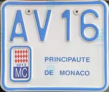 Les deux-roues motorisés, incluant les motocyclettes et les cyclomoteurs, portent une plaque arrière comprenant deux lettres et deux chiffres. Les combinaisons vont de AA01 à YY99. Les séries de lettres MC, MP et PM ne sont pas utilisées car elles sont réservées à la famille princière. Les lettres I, O et W sont également écartées. Les séries VE, EV et EE indiquent des deux roues électriques. Les lettres VE peuvent être placées avant ou après les chiffres[1].