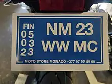 Tous les véhicules immatriculés à Monaco portent une estampille sur leur plaque arrière, à l'exception de la série WW et des plaques princières. Sans estampille, la plaque n'est pas valable. Elle est faite en plastique autocollant et se place dans le rectangle à gauche de la plaque[1].