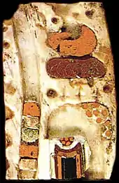 Il s'agit d'une plaque ornée de coquillages (des segments rectangulaires et quasiment plats de coque de Shankha - nom scientifique Turbinella pyrum (en) anciennement Xancus pyrum, grand coquillage des côtes occidentales et orientales de l'Inde)[3], d'incrustations d'or et de verre et représentant peut-être le mythe du Sakuntala[4]. Les segments de coquillage ont été finement creusés par l'artisan, puis les alvéoles ainsi obtenues ont été remplies avec du verre coloré et cerclées de lamelles d'or (technique de l'incrustation sur champlevé)[5].