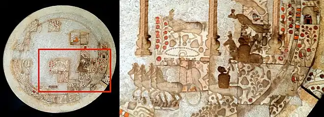 À l'origine, 65 plaquettes fines l'incrustent, dont 33 sont retrouvées et 4 perdues depuis. L'objet a peut-être été l'ornement du revers d'un miroir. Le décor a été restitué par l'archéologue français Claude Rapin[6]. La plaque fait 20,5 cm de diamètre, et est antérieure à 145 av.J-C, date de la destruction d'Ai Khanoum, datant probablement du IIIe – IIe siècles av. J.-C.[1].