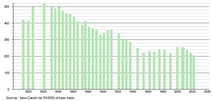 L'évolution du nombre d'habitants est connue à travers les recensements de la population effectués dans la commune depuis 1793. Pour les communes de moins de 10 000 habitants, une enquête de recensement portant sur toute la population est réalisée tous les cinq ans, les populations légales des années intermédiaires étant quant à elles estimées par interpolation ou extrapolation[18]. Pour la commune, le premier recensement exhaustif entrant dans le cadre du nouveau dispositif a été réalisé en 2007[19].