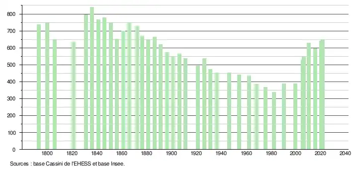L'évolution du nombre d'habitants est connue à travers les recensements de la population effectués dans la commune depuis 1793. Pour les communes de moins de 10 000 habitants, une enquête de recensement portant sur toute la population est réalisée tous les cinq ans, les populations légales des années intermédiaires étant quant à elles estimées par interpolation ou extrapolation[24]. Pour la commune, le premier recensement exhaustif entrant dans le cadre du nouveau dispositif a été réalisé en 2005[25].