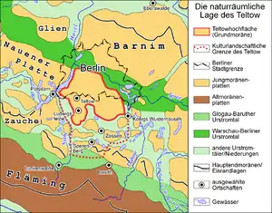 - (de) Cet article est partiellement ou en totalité issu de l’article de Wikipédia en allemand intitulé « Teltow (Landschaft) » (voir la liste des auteurs).