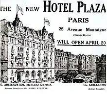 Construit en deux campagnes entre 1902 et 1909, l'hôtel Plaza Athénée est un hôtel de luxe de huit étages, réalisé dans un style éclectique par les architectes Charles Lefebvre[2] et Louis Duhayon (auteurs de l'hôtel Claridge sur l'avenue des Champs-Élysées). En 1913, le théâtre des Champs-Élysées et l'hôtel Plaza s’apprêtent à ouvrir respectivement le et le . Cependant, la marque Plaza n’ayant pas été déposée, un concurrent attaque la société de l’hôtel pour similitude de nom. L’ouverture est donc retardée. Heureusement, Émile Armbruster, le directeur général de l’époque, a alors l’idée d’apposer le nom de l’hôtel dont il avait précédemment la responsabilité, « l’Athénée », à celui de « Plaza ». Le Plaza Athénée est créé et l’hôtel peut donc ouvrir ses portes sans procès le .