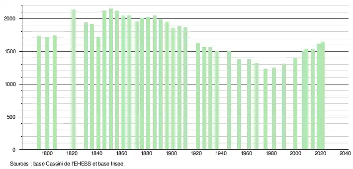 L'évolution du nombre d'habitants est connue à travers les recensements de la population effectués dans la commune depuis 1793. Pour les communes de moins de 10 000 habitants, une enquête de recensement portant sur toute la population est réalisée tous les cinq ans, les populations légales des années intermédiaires étant quant à elles estimées par interpolation ou extrapolation[26]. Pour la commune, le premier recensement exhaustif entrant dans le cadre du nouveau dispositif a été réalisé en 2008[27].