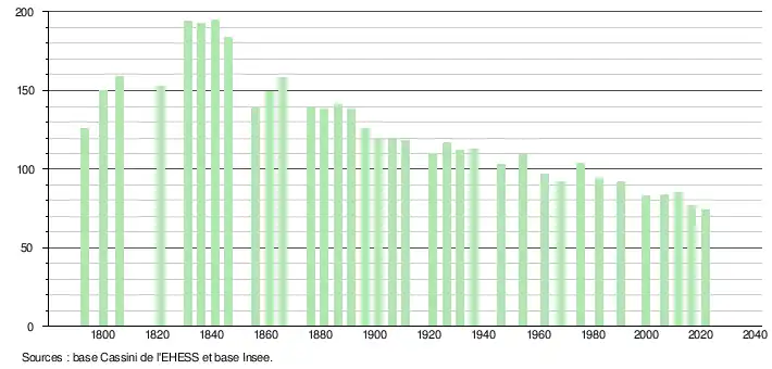 L'évolution du nombre d'habitants est connue à travers les recensements de la population effectués dans la commune depuis 1793. Pour les communes de moins de 10 000 habitants, une enquête de recensement portant sur toute la population est réalisée tous les cinq ans, les populations légales des années intermédiaires étant quant à elles estimées par interpolation ou extrapolation[15]. Pour la commune, le premier recensement exhaustif entrant dans le cadre du nouveau dispositif a été réalisé en 2006[16].