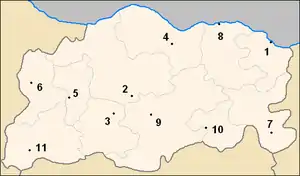 Les noms de localités en caractères gras ont le statut de ville (en bulgare : град, translittéré en grad). Les autres localités ont le statut de village (en bulgare : село translittéré en selo).