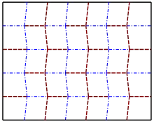 Dans l'autre direction, les plis zigzaguent, et chaque parallélogramme est le translaté de son voisin par rapport au pli. Chacun des chemins de plis en zigzags est composé seulement soit de plis montagne ou de plis vallée, avec les montagnes alternant avec les vallées d'un zigzag à l'autre. Chaque alignement de plis alterne les plis montagne et vallée[2].