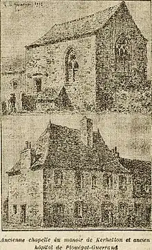 Le manoir de Kerhallon appartint à l'origine à la famille Goallon et en a conservé le nom quelque peu contracté. Il a aussi donné son nom originel à la paroisse qui se dénommait Plougat-Kergoallon, avant que son nom ne devienne Plouégat-Guerrand après l'érection de la seigneurie de Guerrand en marquisat. La branche aînée de la famille Goallon disparut dès le XIVe siècle et le manoir devint la propriété d'Even Charruel, avant de passer aux mains de la famille de Penhoat (par exemple Alain de Penhoat était seigneur de Kergoallon en 1500), puis de la famille Groesquer à la suite du mariage vers 1580 d'Aliette de Penhoat avec Jean de Groesquer, originaire de Pédernec. En 1988, le manoir fut vendu à l'abbé Constantin de Montriou, conseiller au Parlement de Bretagne ; l'acte de vente indique que la seigneurie de Kerhallon, qui s'étendait sur les paroisses de Plouégat-Goallon, Plestin et Trémel sa trève, Lanmeur et Locquirec sa trève, Guimaëc et Plougasnou, bénéficiait d'un droit de péage sur le pont franchissant le Douron au Pont-Haouël, de droit de pêcher le saumon dans la rivière d'Ouff (nom que portait alors le Douron) « en faisant lever les écluses de 17 moulins, depuis celui d'Ancremel jusqu'à la mer » et possédait plusieurs convenants. La seigneurie disposait aussi du droit de haute justice, ses piliers de justice étant situés au sommet de la lande escarpée de Lanvizinec et, dans l'église paroissiale, de la chapelle Sainte-Anne, « située du côté de l'Évangile » ; par contre la chapelle domestique du manoir était déjà ruinée. En 1738, un membre de la famille Groesquer en est à nouveau propriétaire (Auguste-François de Groesquer, lequel prit part à la conspiration de Pontcallec et fut condamné à mort par contumace ; ensuite amnistié, il décéda en 1757 et la terre de Kerhallon fut alors achetée par le marquis de Locmaria et devint une annexe de la seigneurie de Guerrand)[17]. Cet ancien manoir a presque totalement disparu de nos jours même si quelques murs subsistent ou du moins subsistaient en 1932 selon Louis Le Guennec[18].