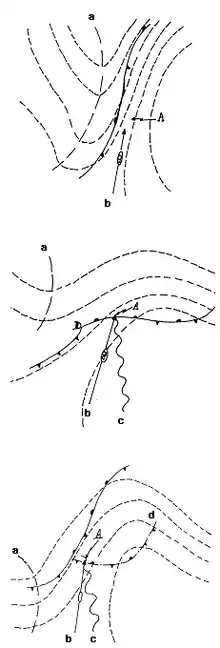 Un météorologue du National Weather Service américain, R. A. Maddox, est particulièrement connu pour la classification de trois types de circulations atmosphériques très propices à la formation d'orages à répétition. La caractéristique principale de ces flux est que les orages, même bénins, se reproduisent au même endroit ou défilent le long du même corridor et finissent par donner des accumulations impressionnantes. C'est ce qui est appelé des orages en série, en train, à formation rétrograde ou en V. Dans l'image de droite, qui illustre ces trois configurations, l'air circule parallèlement aux isobares (lignes tiretées).