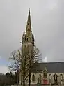 Inscrit MH (1928)[53], dans le village du même nom et située sur les hauteurs du Blavet, elle est construite au XVIe siècle en style gothique. Dotée d'un plan en forme de croix, elle comprend au chevet d'une fenêtre à trois fleurs de lys, une belle charpente soutenue par des sablières ornées de sculptures naïves dans le chœur et les transepts. Dans le côté sud, se trouve une porte avec accolade. Les niches et les ouvertures sont sculptées dans le style gothique flamboyant. Un bénitier en forme de trèfle à quatre feuilles se trouve à côté du chœur.