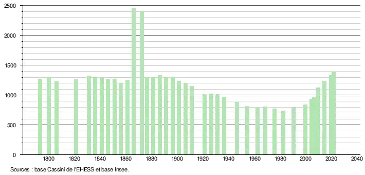 L'évolution du nombre d'habitants est connue à travers les recensements de la population effectués dans la commune depuis 1793. Pour les communes de moins de 10 000 habitants, une enquête de recensement portant sur toute la population est réalisée tous les cinq ans, les populations légales des années intermédiaires étant quant à elles estimées par interpolation ou extrapolation[17]. Pour la commune, le premier recensement exhaustif entrant dans le cadre du nouveau dispositif a été réalisé en 2004[18].