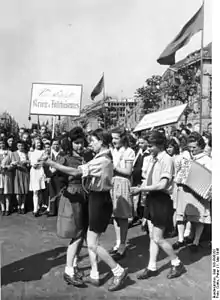 Le premier mai 1946, on danse dans les rues de Berlin avec ce slogan « Nie wieder Krieg » (voir illustration).