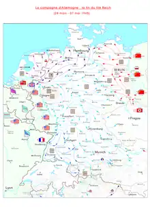 Face aux armées alliées, il ne reste que les reliques d'une Wehrmacht désintégrée, quelques unités d'entraînement SS et un grand nombre de Volkssturm, des unités de milice de personnes âgées, incluant certains vétérans de la Première Guerre mondiale, et des Hitlerjugend, les Jeunesses hitlériennes, des unités composées des jeunes garçons dont certains d'à peine 12 ans.