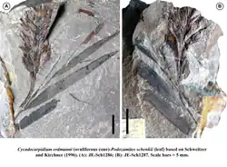 Podozamites est un genre fossile de feuilles de conifères fossiles. Dans son sens plus large, il a été utilisé comme morphogène (taxon de forme) pour désigner toutes les feuilles de conifères à nervures multiples à feuilles larges. Les conifères à feuilles larges modernes avec une forme similaire incluent Agathis dans la famille des Araucariaceae et Nageia dans les Podocarpaceae, avec certains Podozamites sensu lato appartenant probablement aux mêmes familles[1].