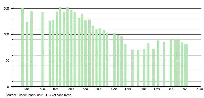 L'évolution du nombre d'habitants est connue à travers les recensements de la population effectués dans la commune depuis 1793. Pour les communes de moins de 10 000 habitants, une enquête de recensement portant sur toute la population est réalisée tous les cinq ans, les populations légales des années intermédiaires étant quant à elles estimées par interpolation ou extrapolation[37]. Pour la commune, le premier recensement exhaustif entrant dans le cadre du nouveau dispositif a été réalisé en 2005[38].