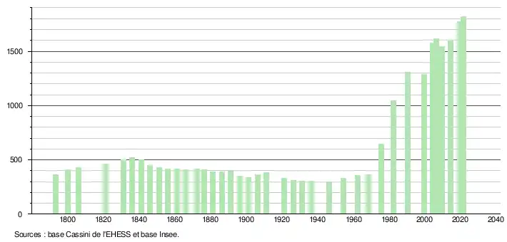 L'évolution du nombre d'habitants est connue à travers les recensements de la population effectués dans la commune depuis 1793. Pour les communes de moins de 10 000 habitants, une enquête de recensement portant sur toute la population est réalisée tous les cinq ans, les populations légales des années intermédiaires étant quant à elles estimées par interpolation ou extrapolation[48]. Pour la commune, le premier recensement exhaustif entrant dans le cadre du nouveau dispositif a été réalisé en 2004[49].