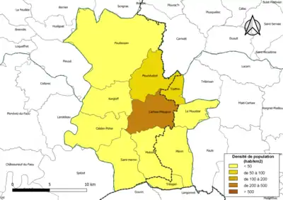 Carte des densités de population (millésimée 2016) des communes de l'intercommunalité Poher communauté. Composition en communes au [4].
