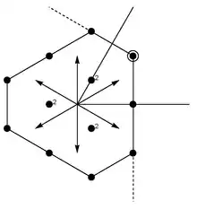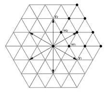 La figure ci-dessus montre l'exemple de l'algèbre de Lie sl(3, C), dont le système de racines est de type . Il y a deux racines simples, et . Le premier poids fondamental, , est orthogonal à et se projette orthogonalement sur la moitié de et de même pour . Le réseau des poids est alors le réseau triangulaire.