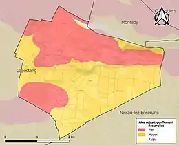 Le retrait-gonflement des sols argileux est susceptible d'engendrer des dommages importants aux bâtiments en cas d’alternance de périodes de sécheresse et de pluie. 99,6 % de la superficie communale est en aléa moyen ou fort (59,3 % au niveau départemental et 48,5 % au niveau national). Sur les 272 bâtiments dénombrés sur la commune en 2019, 272 sont en aléa moyen ou fort, soit 100 %, à comparer aux 85 % au niveau départemental et 54 % au niveau national. Une cartographie de l'exposition du territoire national au retrait gonflement des sols argileux est disponible sur le site du BRGM[24],[Carte 2].