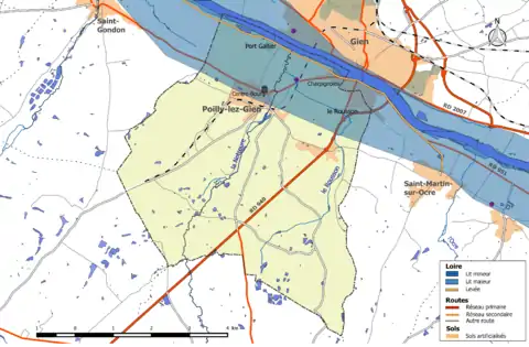 Le cours de la Loire s’insère dans une large vallée qu’elle a façonnée peu à peu depuis des milliers d’années. Elle traverse le sud du département du Loiret depuis Beaulieu-sur-Loire jusqu'à Beaugency, avec un cours large et lent. La Loire présente des fluctuations saisonnières de débit assez marquées[16]. Son débit est régulé par des barrages amont (Naussac en amont sur l’Allier et Villerest). Ces barrages interviennent pour le soutien d’étiage (débit minimum de 60 m3/s en étiage à Gien) et Villerest permet également d’écrêter les crues. La Loire est un cours d’eau domanial classé en deuxième catégorie piscicole. L'espèce biologique dominante est constituée essentiellement de poissons blancs (cyprinidés) et de carnassiers (brochet, sandre et perche). La station hydrométrique la plus proche de la commune et servant de référence en cas de crue est celle de Gien. Le débit mensuel moyen (calculé sur 82 ans pour cette station) varie de 102 m3/s au mois d'août à 593 m3/s au mois de février. La Loire connaît toutefois en cas d'intempéries exceptionnelles des pics de débits très importants, le maximum ayant été atteint sur cette station le avec 3 320 m3/s et une hauteur de 5,03 m[17],[18]. Le débit maximum de la Loire ayant été atteint lors des crues de 1856 ou 1866 avec une valeur de l'ordre de 7 000 m3/s, la hauteur maximale ayant été atteinte le avec 7,19 m[19].