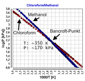 D'autre part, si l'extrémum est un maximum, la pression de l'azéotrope à la température de Bancroft est supérieure à la pression de Bancroft, il s'agit d'un azéotrope positif. Si l'extrémum est un minimum, la pression de l'azéotrope à la température de Bancroft est inférieure à la pression de Bancroft, il s'agit d'un azéotrope négatif.