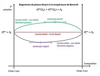 La droite d'équation passant par les deux points définis précédemment représente ainsi la courbe d'ébullition et la courbe de rosée du mélange idéal confondues. Cette droite est horizontale dans le diagramme de phases, voir figure 2. En conséquence, à la température de Bancroft un mélange des deux corps se comporte comme un corps pur quelle que soit la composition du mélange.