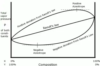Si le mélange présente un caractère non idéal suffisamment prononcé, les pressions d'ébullition et de rosée du mélange peuvent prendre des valeurs supérieures à la plus grande des deux pressions de vapeur saturante, ou inférieures à la plus petite des deux pressions de vapeur saturante. Dans ces conditions, les courbes d'ébullition et de rosée présentent nécessairement un extrémum correspondant à un azéotrope selon le théorème de Gibbs-Konovalov, voir figure 3.