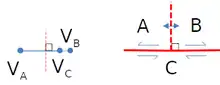 Par conséquent, par rapport au triangle dans l'espace des vitesses, le point devra dans ce cas se situer sur la droite passant par et . De plus, on peut noter que dans ce cas, la direction de la frontière (AB) est donc la même que celle de . Noter cependant que dans ce cas, la position relative des deux plaques de part et d'autre de la frontière n'est pas directement déterminée, conduisant potentiellement à deux solutions dans l'espace géologique suivant que la faille transformante est lévogyre ou dextrogyre.