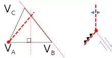 Par conséquent, par rapport au triangle , le point représentatif de la vitesse devra se situer sur une droite passant par , et de même direction que la frontière (AB), quelle qu'elle soit. Noter que dans ce cas, la position de A et B est inversée entre le schéma géologique et le schéma des vitesses.