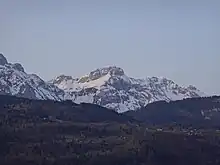 Vue de la partie centrale de la chaîne du Bargy depuis Marignier au nord avec de gauche à droite la pointe Dzérat, la pointe du Midi, la pointe Blanche et le pic de Jallouvre.