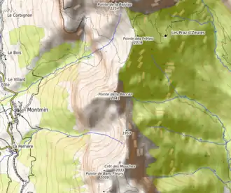Vue du synclinal d'Arclosan depuis le col de la Forclaz à l'ouest avec, de gauche à droite, la pointe de la Beccaz, le crêt des Mouches, la pointe de Banc Fleury et le Bonverday dominant le village de Montmin. | |||
