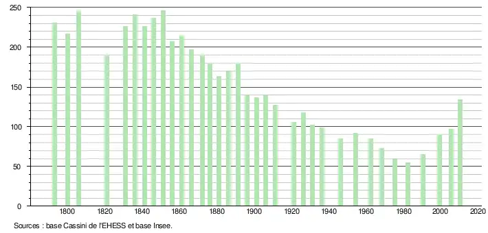 L'évolution du nombre d'habitants est connue à travers les recensements de la population effectués dans la commune depuis 1793. À partir du , les populations légales des communes sont publiées annuellement dans le cadre d'un recensement qui repose désormais sur une collecte d'information annuelle, concernant successivement tous les territoires communaux au cours d'une période de cinq ans. Pour les communes de moins de 10 000 habitants, une enquête de recensement portant sur toute la population est réalisée tous les cinq ans, les populations légales des années intermédiaires étant quant à elles estimées par interpolation ou extrapolation[4]. Pour la commune, le premier recensement exhaustif entrant dans le cadre du nouveau dispositif a été réalisé en 2005[5],[Note 1].