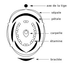 La formule florale est donc 5S 5P 10E 1C (formule simplifiée) ou •|• S(5) P5 E(9)+1 C1 (formule complète)[8].