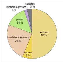 Les cotylédons contiennent des substances de réserve, en moyenne 50 % d'amidon et jusqu'à 25 % de protéines (chez le pois protéagineux). L'amidon est constitué d'amylose et d'amylopectine en proportions variables : plus d'amylopectine chez les variétés à graines lisses et plus d'amylose chez celles à graines ridées, qui contiennent par ailleurs plus de sucres (voir le paragraphe Composition et valeur nutritive)[11]. La partie protéique est constituée essentiellement de trois fractions protéiques solubles : les albumines, les vicilines et les convicilines, et la légumine. La fraction des albumines contient, en faible teneur, diverses protéines enzymatiques biologiquement actives : lipoxygénases, lectines, inhibiteurs de protéases[12].