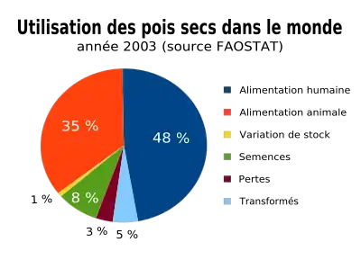 Depuis le début des années 1990, le Canada, cherchant à diversifier ses productions agricoles, a doublé sa production de pois secs (cultivés principalement dans les provinces de Manitoba, Saskatchewan et Alberta) dont il est devenu le premier producteur mondial et également le premier exportateur, notamment vers l'Inde[41] - pour des débouchés en alimentation humaine essentiellement.