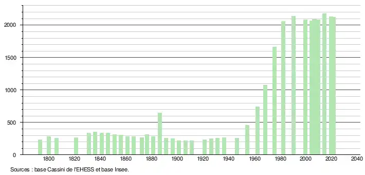 L'évolution du nombre d'habitants est connue à travers les recensements de la population effectués dans la commune depuis 1793. Pour les communes de moins de 10 000 habitants, une enquête de recensement portant sur toute la population est réalisée tous les cinq ans, les populations légales des années intermédiaires étant quant à elles estimées par interpolation ou extrapolation[21]. Pour la commune, le premier recensement exhaustif entrant dans le cadre du nouveau dispositif a été réalisé en 2004[22].